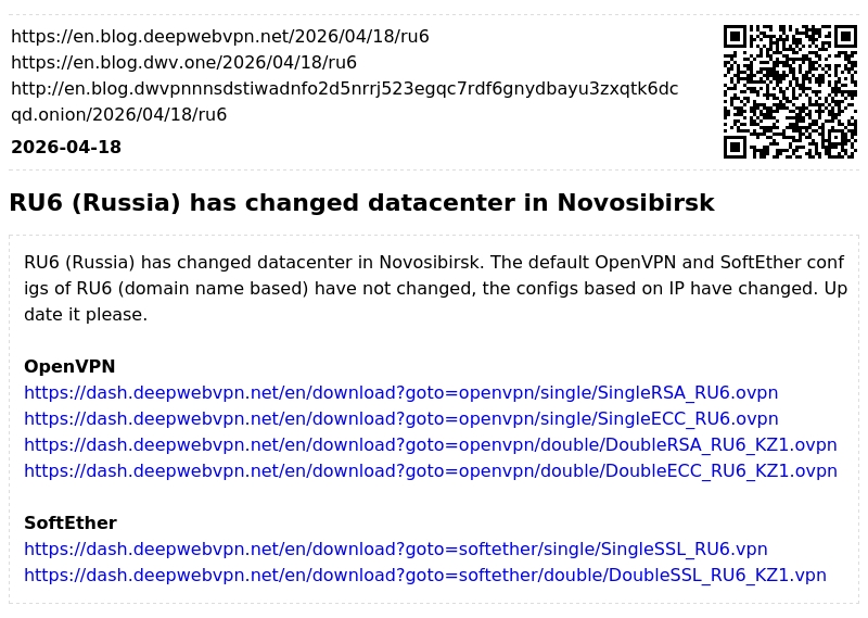 Servers CA1 (Toronto, Canada), DE2 (Frankfurt am Main, Germany), IN1 (Mumbai, India), KR1 (Seoul, S. Korea) and RS1 (Belgrade, Serbia) have changed datacenters. The default OpenVPN and SoftEther configs of CA1, DE2, IN1, KR1 and RS1 (domain name based) have not changed, the configs based on IP have changed. Update it please.